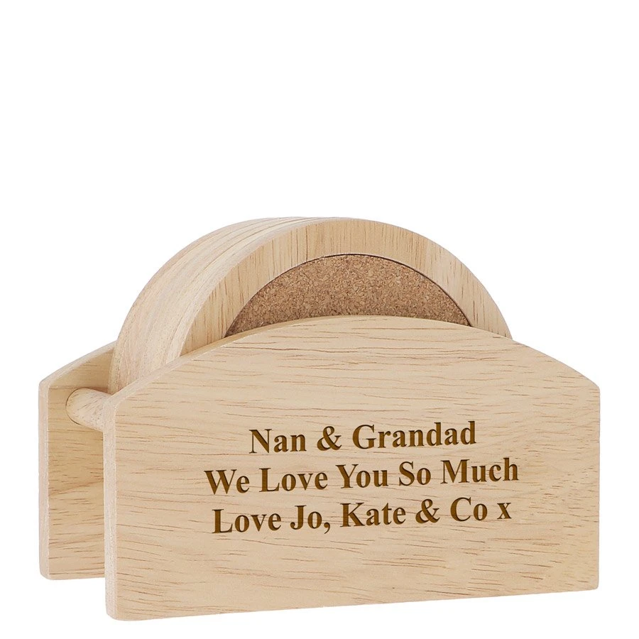 With a stylish wooden finish, the coaster holder will display your personal message.