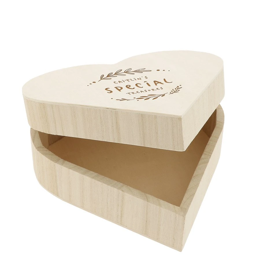 Store jewellery, trinkets or photographs inside this Personalised Heart Jewellery / Keepsake Box – Treasures. The charming box benefits from a high-quality wooden build that will last a lifetime.